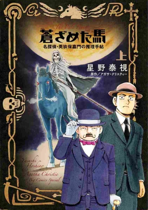 Aozametauma (蒼ざめた馬 - the Pale Horse) is a Japanese manga published in 2017. The full title is Aozametauma - mei tantei Ei Kubo Kamon no suiri techō (蒼ざめた馬 - 名探偵・英玖保嘉門の推理手帖 = the Pale Horse - Great Detective Eikubo Kamon's Deduction Notebook). The manga is drawn by Hoshino Yasumi (星野 泰視) and published by Shogakukan (小学館). The manga is in 2 volumes and is an adaptation of Agatha Christie's The Pale Horse.