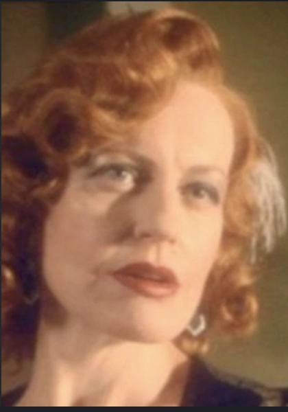 She is described as a "tall woman with a figure perfectly disciplined to the demands of the moment". Her hair is dyed a greenish bronze colour, and set in a clever and novel style. She has "plucked eyebrows, darkened lashes", an "exquisitely made-up face", and a "mouth lipsticked to a curve that its naturally straight line did not possess".